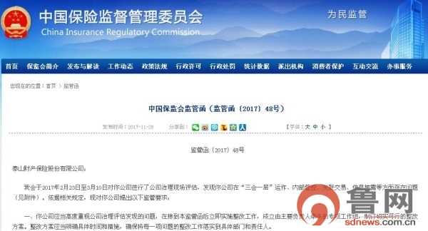 鲁网11月29日讯(记者杨永明)中国保险监督管理委员会(下称保监会)对泰山财产保险股份有限公司(下称泰山财险)进行公司治理现场评估中发现,泰山财险在“三会一层”运作、内部管控、关联交易、信息披露等方面存在问题。
