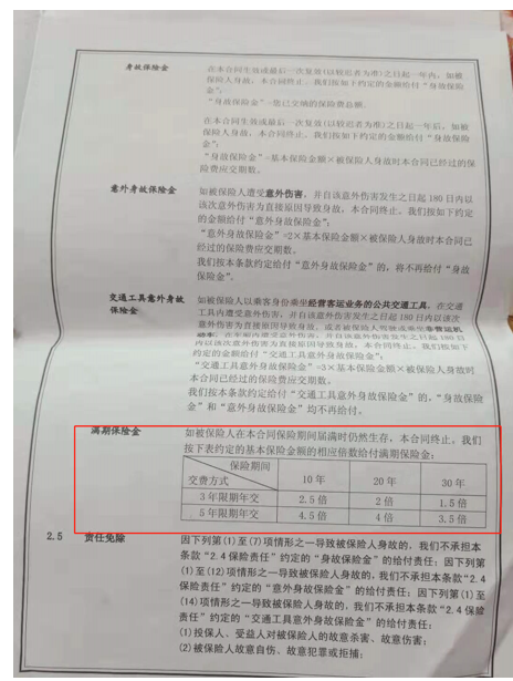 宣传单中关于“固定回报10%”收益部分,在李先生的保单中其实是以“生存保险金 ”的形式核发,合同条款规定:“自本合同生效日起,如被保险人生存,我们在每经过2个保单年度时,按基本保险金额的 10%给付一次生存保险金,直至保险期间届满。首期生存保险金于本合同第2个保单年度结束时给付。”根据保单合同计算,李先生的生存保险金总计为:3万元*10%*5=1.5万元。