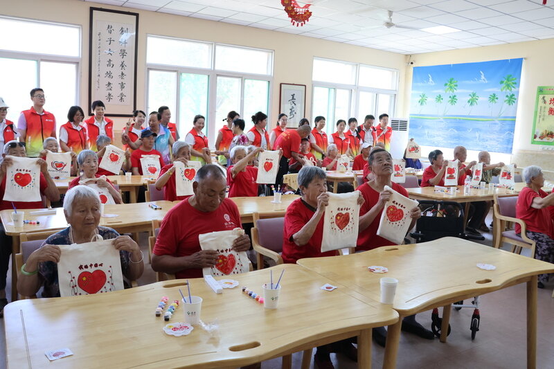 在济南,志愿者与老人一起为爱国爱党主题帆布包涂色,用画笔勾勒爱国情怀,用色彩共绘盛世华章。泰康口腔医生为老人讲解口腔健康知识,开展口腔健康检查。