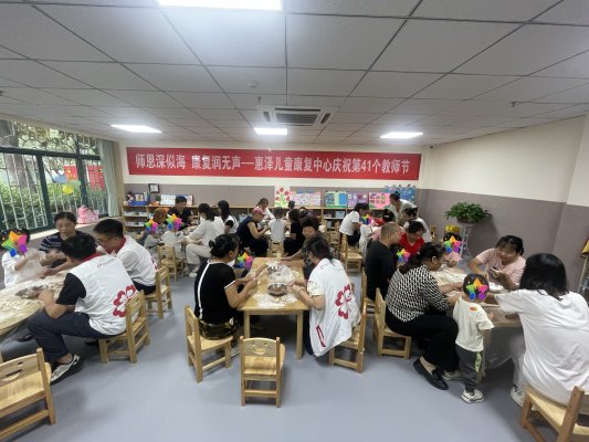 2025年9月8日,在第41个教师节即将到来之际,百年人寿济宁中支携手济宁市惠泽儿童康复中心共同举办了一场别开生面的“情暖教师节,爱心志愿行”教师节庆祝活动,现场邀请康复中心特教老师、“星童”、家长及志愿者共同参与,整个康复中心洋溢着浓浓的感恩与温馨氛围。