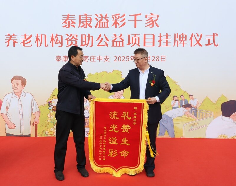 枣庄市市中区社会福利中心主任代表院方向泰康赠送锦旗,感谢爱心捐助,表示将与泰康一起,为老年人提供更专业优质的服务,帮助更多老人享有健康幸福的晚年。