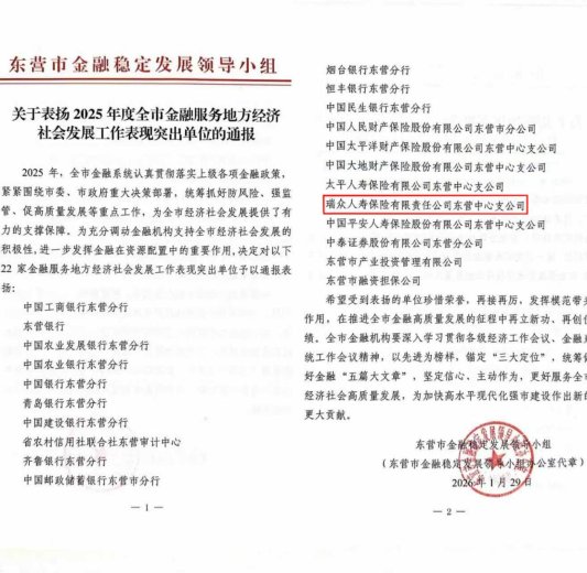 近日,东营市金融稳定发展领导小组印发《关于表扬2025年度全市金融服务地方经济社会发展工作表现突出单位的通报》,瑞众保险东营中心支