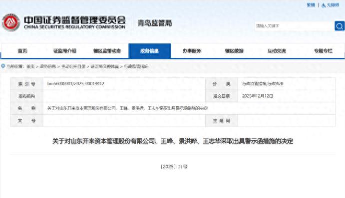 12月12日,证监会青岛监管局官网披露的行政监管措施决定书显示,山东开来资本管理股份有限公司以及王峰、景洪晔、王志华因三项违法违规