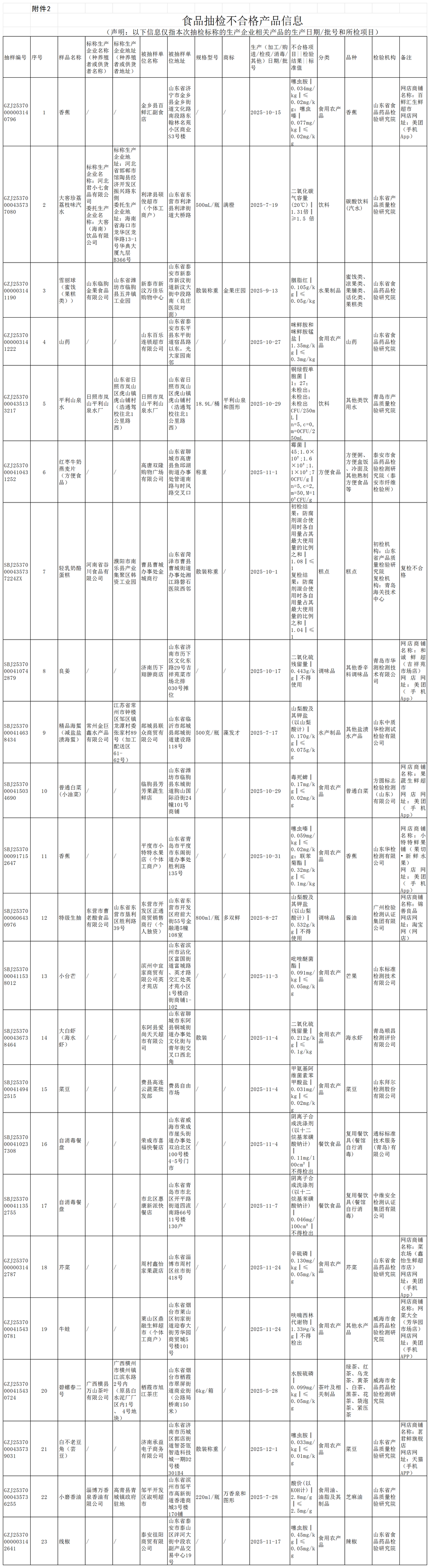 根据《中华人民共和国食品安全法》及其实施条例等有关规定和山东省食品安全监督抽检计划安排,为进一步保障食品安全,省市场监管局对餐饮食品、茶叶及相关制品、炒货食品及坚果制品、淀粉及淀粉制品、方便食品、糕点、粮食加工品、肉制品、食用农产品、食用油、油脂及其制品、水产制品、水果制品、速冻食品、调味品、饮料共783样品进行了监督抽检,其中合格产品760批次,不合格产品23批次。