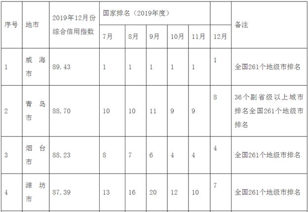 今日,记者从山东省社会信用体系建设领导小组办公室了解到,自2015年起,国家发展改革委组织国家信息中心中经网对全国600多个城市的信用状况进行大数据监测,山东省16市和27个县级市目前列入监测范围。根据国家发布的2019年下半年城市综合信用指数监测数据,记者发现,威海市与荣成市分别位列全国城市信用指数地级市与县级市的第一名。