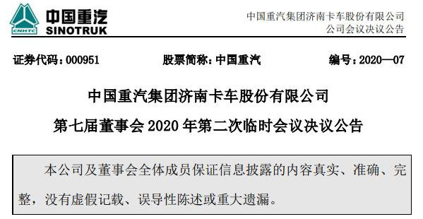 11日,中国重汽集团济南卡车股份有限公司(中国重汽.000951.SZ)发布第七届董事会2020年第二次临时会议决议公告,经董事全票通过,选举王德春担任公司董事长,任职自此次董事会审议通过之日起至第七届董事会届满之日止。