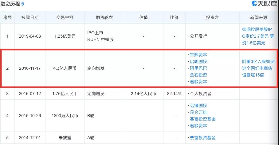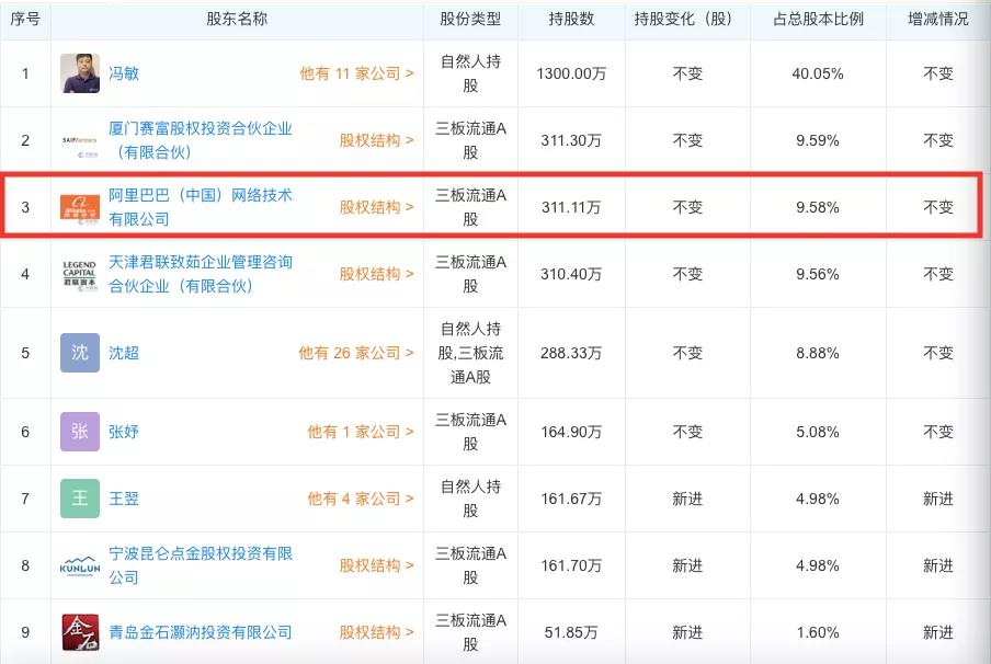 阿里巴巴曾参与如涵C轮和新三板定增两轮融资。山东财经报道从天眼查看到,阿里巴巴(中国)网络技术有限公司持有如涵9.58%的股份,为第三大股东。