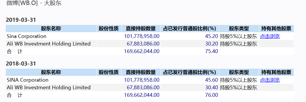 据微博向美国SEC递交的文件,截至2019年3月31日,新浪持有微博45.2%股权,为第一大股东,拥有71.2%的投票权;阿里持股30.2%,拥有15.8%的投票权,为微博第二大股东。资料显示,阿里巴巴曾在2013年4月以5.86亿美元收购新浪微博18%股份,交易完成后阿里巴巴成为新浪微博第二大股东。