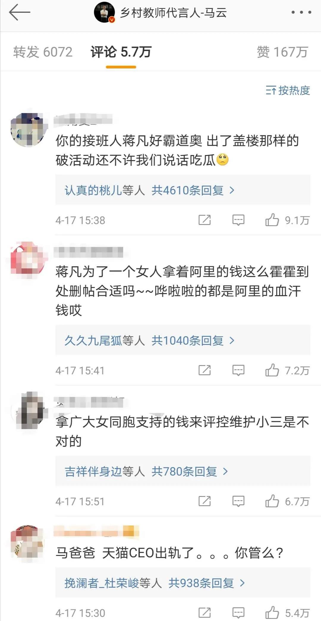 一位圈内人士对山东财经报道说,“微博热搜应该是被降维了。”想评论却四处碰壁找不到评论出口的网友们,纷纷在马云微博下留言。截止到4月20日8点,马云微博最近更新的一条微博下已经有5.7万评论。