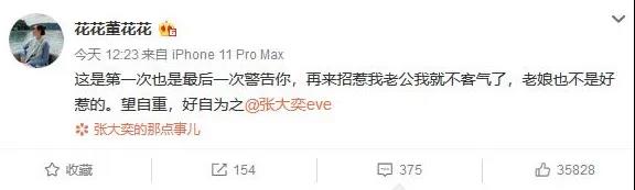 4月17日,微博用户@花花董花花向知名带货网红张大奕喊话:“这是我第一次也是最后一次警告你,再来招惹我老公我就不客气了,老娘也不是好惹的。望自重,好自为之。”