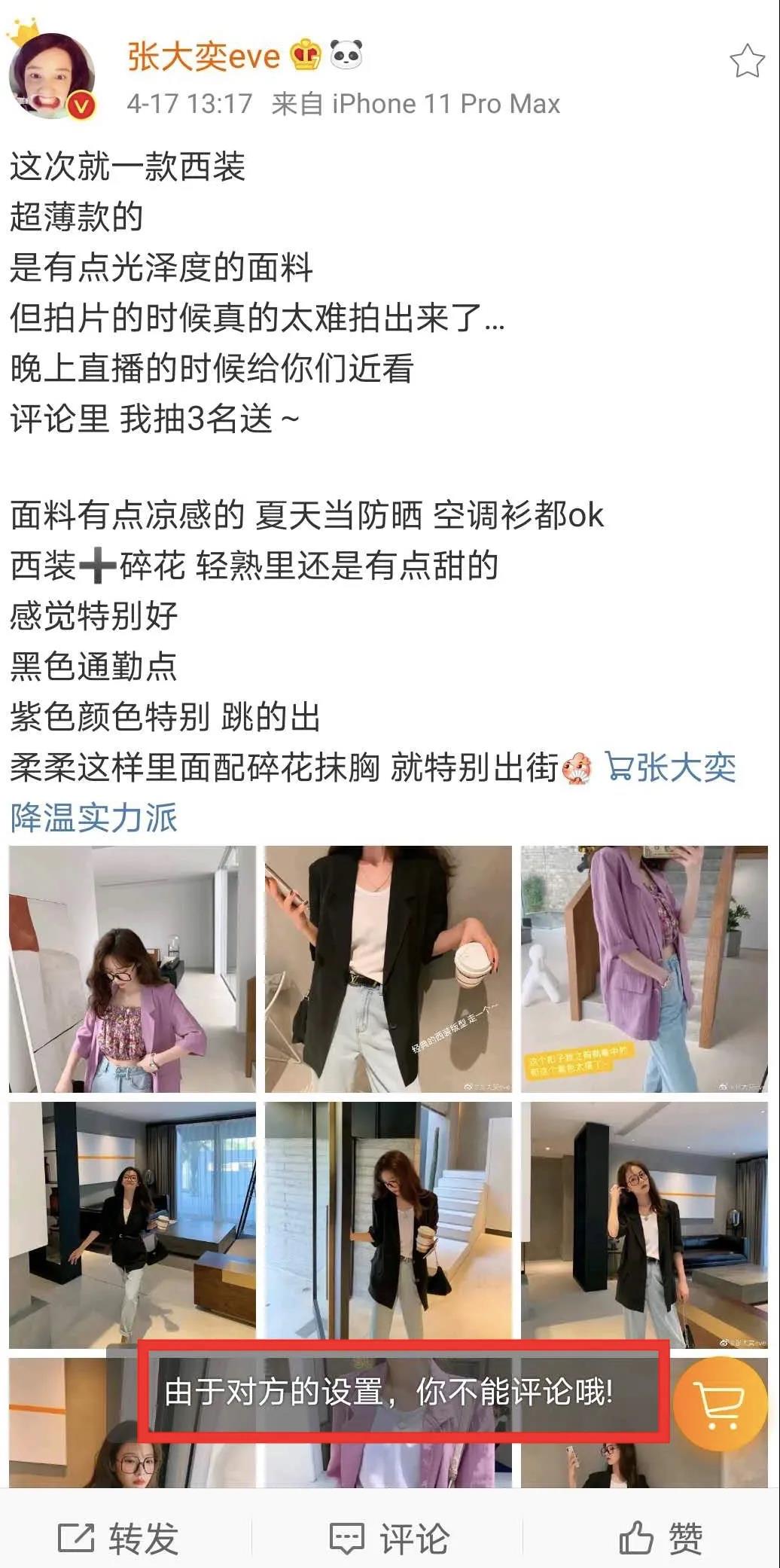 另一个被点名的“女主角”张大奕在同一天,在其微博上发布了3条微博都是关于她经营的网店服饰推荐,还有一条是点赞她网店微博,并且张大奕微博下的评论功能也已经关闭。