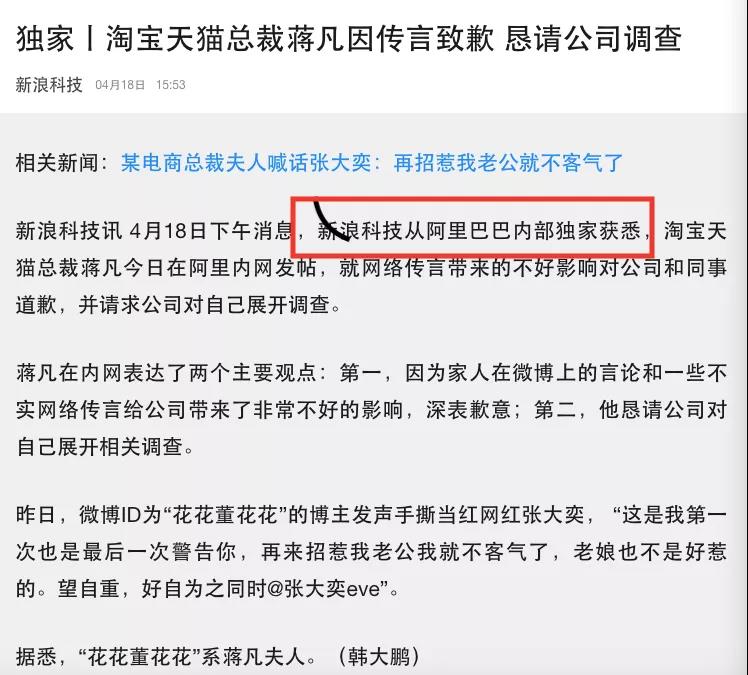 彼时,时任阿里巴巴集团董事局主席的马云表示:“两大平台的结合,不仅有助于我们在移动互联网的布局和发展,而且会给微博用户带去更多独特、健康、持久的服务。我们有理由期待更多的惊喜。”山东财经报道发现,新浪科技在随后的事件发展中“拔得头筹”。有关于蒋凡在内网致歉恳求公司调查、阿里巴巴首席人才官称会正式进行调查、澄清网传蒋凡调任阿里大文娱集团等阿里巴巴方面消息都出率先出自新浪科技。19日,山东财经报道就蒋凡事件电话联系阿里方面,相关工作人员接听电话后表示,“谁给您的我的电话呀?我需要第三方认证”、“我们都是有熟人介绍的”。在山东财经报道记者说到不方便提供姓名时,该工作人员表示因不能核实记者身份,不方便接受采访。随后,山东财经报道通过微信方式将记者证发送过去,但该工作人员依旧坚持,“需要第三方的朋友证明一下”、“您要采访的选题背后,发现有其它机构在推动和引导舆论,所以确认公正性也是我的工作职责。”事实上,在@花花董花花点名张大奕之后的一天后,蒋凡就作出回应。新浪科技率先在网络上发布文章《独家丨淘宝天猫总裁蒋凡因传言致歉 恳请公司调查》。