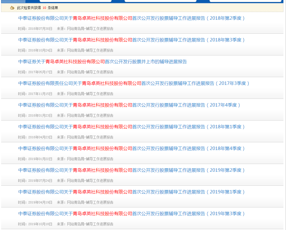 此外,记者梳理发现,在青岛2020新披露辅导进展的企业中,青岛大牧人机械股份有限公司与青岛卓英社科技股份有限公司结束辅导的时间已经已横跨3年之久。据了解,青岛大牧人机械股份有限公司是于2017年1月26日接受上市辅导,而青岛卓英社科技股份有限公司虽然接受辅导时间未知,但从青岛证监局给出的数据看,其接受辅导时间也已从2017年横跨至2019年。 记者 黄钰淇