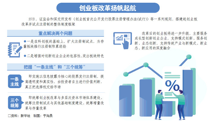证监会和深交所当日发布《创业板首次公开发行股票注册管理办法(试行)》等一系列规则,搭建起创业板改革并试点注册制的整体制度框架。