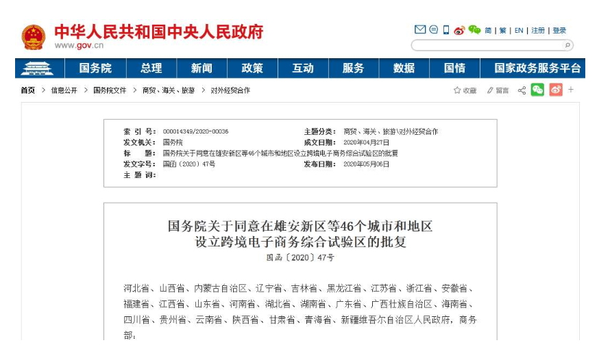 国务院关于同意在雄安新区等46个城市和地区设立跨境电子