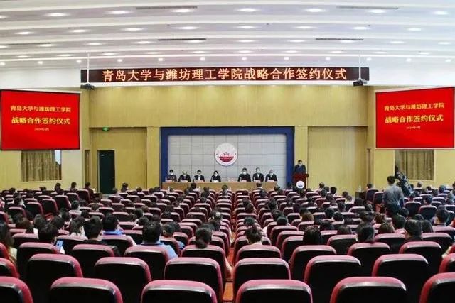 4月18日上午,青岛大学与潍坊理工学院签署战略合作协议。根据协议约定,双方将通过合作项目联合开展青年教师教学能力、科研能力培训工作,促进科技开发、技术服务及科技成果转化,联合培养硕士研究生,共享优质课程资源,调整组建推动地方经济社会发展的优势学科群。