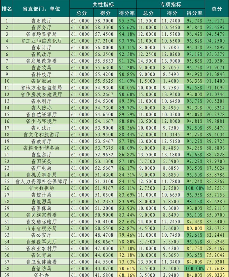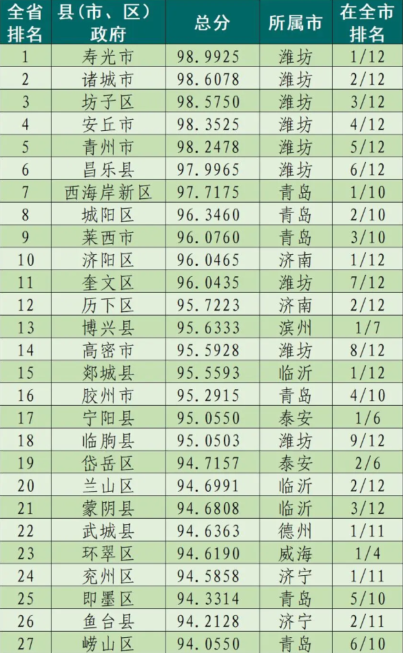 5月29日,山东省政府网站发布山东省计算中心(国家超级计算济南中心)《2019年山东省政务公开第三方评估报告》。本次评估的16家市政府中,潍坊市名列第1位,青岛市、济南市、威海市、济宁市分列第2位到第5位(全部得分及排名表附后)。为深入贯彻党的十九大和十九届二中、三中、四中全会精神,认真落实《中华人民共和国政府信息公开条例》《关于全面推进政务公开工作的意见》和《2019年政务公开工作要点》(国办发〔2019〕14号)部署,进一步推进政务公开工作,提升政府透明度,省政府办公厅通过公开招标的方式,委托山东省计算中心(国家超级计算济南中心)政务公开评估工作组对39家省直部门、单位,16市政府和137家县(市、区)政府2019年的政务公开工作进行了评估,并针对当前存在的问题提出了改进建议。本次评估,采用主观与客观相结合,人工评价与计算机评价相结合的评估手段,通过观测评估对象门户网站、实际验证等方式,对各级政府依法、准确、全面、及时公开政府信息的情况进行测评,总结政务公开工作中取得的成就,并分析其当前存在的问题。本次评估的总体时间为2019年7月1日至2020年2月29日,集中数据采集时间为2020年1月4日至2020年2月29日,政府信息公开工作年度报告、政府信息公开指南、年度政务公开工作要点或实施方案提前至2019年7月至9月,依申请公开和互动交流的暗访分别于2019年8月至12月陆续发出。本次对于16市政府的评估,在继续将各市所辖全部县(市、区)政府平均得分以30%的比例计入个市政府总分的基础上,又将市属公共企事业单位平均得分以5%的比例计入市政府总分。评估结果显示,16市政府政务公开工作水平仍然保持了较高的水平。(1)16市政府评估得分相对县(市、区)政府仍然较高,且各市差距逐渐缩小。从本次评估结果来看,16市政府平均得分达到了92.4362分,平均得分连续4年稳步提升。本次评估中,16市政府最低得分超过了85分,且得分的中位数约为92.7分,充分说明16市政府得分之间的差距进一步缩小,整体水平较去年又跨上了新的台阶。相比于省直部门、单位和县(市、区)政府,仍然保持着较高的政务公开水平。省直部门、单位,16市政府和县(市、区)政府每年都在进步和提升,特别是县(市、区)政府本次评估平均得分达到了88.4189分,较去年提高了2分之多。说明在16市政府的统一指导和督促下,各县(市、区)政府不断加快标准化规范化建设,政务公开意识和水平显著提升,有序推动,逐步走向全面推进的新阶段。(2)市域统筹推进、市县共同发展的格局初现。2019年,我省政务公开工作呈现出了“市域统筹推进、市县共同发展”的良好格局。市本级政府得分和所辖县(市、区)政府平均得分之间存在着较大的关联性,16市政府统筹推进力度大的,整体水平会有明显提升。如潍坊、青岛、济南、威海、济宁、聊城、临沂等市政府,市本级政府得分和所辖县(市、)区政府平均得分均较高;东营、德州、泰安等市政府在所辖各县(市、区)政府整体水平提升上成绩较为显著,市本级政府成绩有待进一步提升;日照、烟台、滨州等市政府,市本级政府得分较高,对所辖县(市、区)政府协调推进力度有待进一步加大;枣庄、菏泽、淄博等市政府,市本级政府和所辖各县(市、区)政府整体政务公开水平还有待进一步提升。(3)政务公开已成为各市经济社会发展的助推器。2019年12月25日至26日,山东省委经济工作会议上提出,2020年山东一项重点工作是推进省会、胶东、鲁南三大经济圈一体化发展。胶东经济圈(包括青岛市、烟台市、潍坊市、威海市和日照市)政务公开第三方评估平均得分为94.5373分,省会经济圈(包括济南市、淄博市、泰安市、东营市、滨州市、德州市和聊城市)平均得分为91.8461分,鲁南经济圈(包括临沂市、枣庄市、济宁市和菏泽市)平均得分为90.8425分。说明随着我省顺应国家重大区域战略实施,积极推进省会、胶东、鲁南三大经济圈一体化发展,胶东和省会经济圈逐步将推进政务公开作为提升治理体系和治理能力现代化、优化营商环境的重要举措,整体水平领跑于鲁南经济圈,政务公开已成为经济社会发展的有力助推器。(4)行政权力运行公开得分指数略有波动,其余指标进步明显。从各一级指标的得分指数来看,各项指标平均得分指数均超过了86%,仍然保持了较高的标准。与2018年相比,行政权力运行公开指标的平均得分指数略有下降,其余一级指标的平均得分指数均有上升,其中,依申请公开指标平均得分指数提高了9.18个百分点。说明16市政府及其部门年内不断强化依法行政意识,建立健全依申请公开的受理、办理、答复、审核、反馈等各环节程序,依法依规答复。