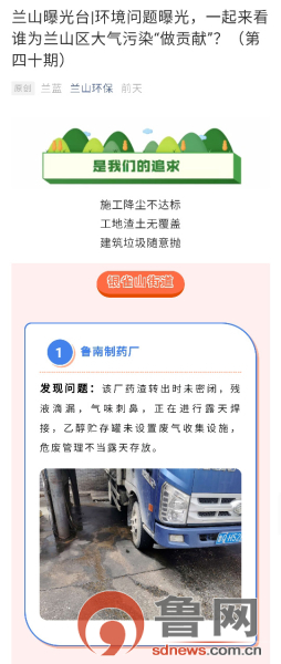 上述通报即为临沂市环境保护局兰山分局(下称兰山环保局)在其官方微信公众号《兰山环保》发布的一篇题为《兰山曝光台|环境问题曝光,一起来看谁为兰山区大气污染“做贡献”?(第四十期)》文章,刊文中涉及鲁南制药厂存在大气污染的相关内容。