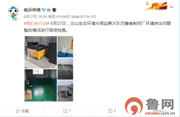 记者从公开渠道获悉,6月27日,临沂市环境保护局官方微博《临沂环境》发布消息,“6月27日,兰山生态环境分局监察大队对鲁南制药厂环境突出问题整改情况进行现场检查。”微博还附有整改检查现场图片。(本网记者)