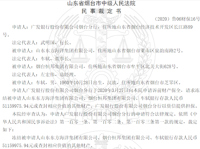 5月11日,中国裁判文书网发布《广发银行股份有限公司烟台分行、山东东方海洋集团有限公司其他民事裁定书》(2020)鲁06财保16号,裁定书显示,申请人广发银行股份有限公司烟台分行于2020年3月27日向本院申请诉前财产保全,请求冻结被申请人山东东方海洋集团有限公司、烟台恒邦集团有限公司、车轼银行存款人民币5116万元或查封相应价值的其他财产。广发银行股份有限公司烟台分行以资信提供担保。