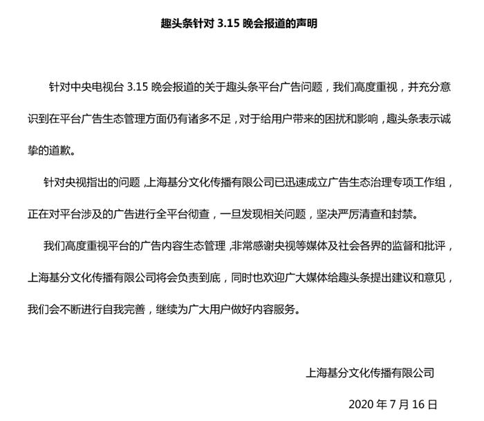 对此,趣头条回应,正在对平台涉及的广告进行全平台彻查,一旦发现相关问题,坚决严厉清查和封禁。有意思的是,央视还没具体列举趣头条详细的问题,趣头条就公开发了声明。网友:一看就是样板回应,没诚意。