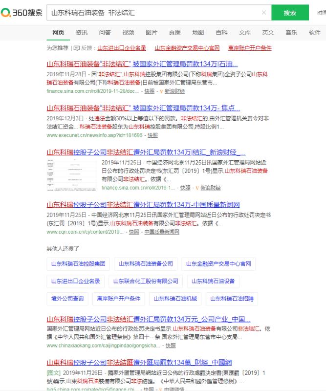 (媒体发布科瑞石油非法结汇被处罚消息截图)