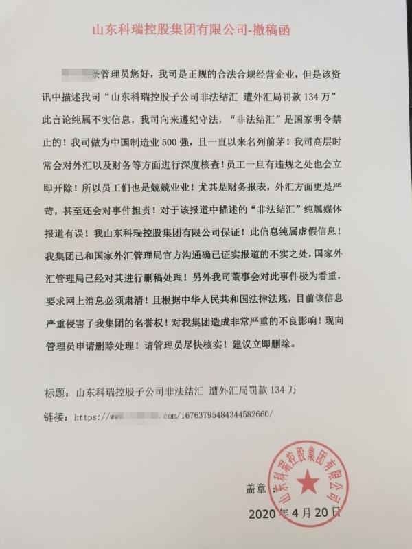 日前,鲁网收到某媒体平台转来的题为《山东科瑞控股集团有限公司-撤稿函》材料。该材料对媒体平台表示,“我公司是正规的合法合规经营企业,但是该资讯中描述我司‘山东科瑞控股子公司非法结汇 遭外汇局处罚134万’此言论纯属不实信息,我司向来遵纪守法,‘非法结汇’是国家明令禁止的!”