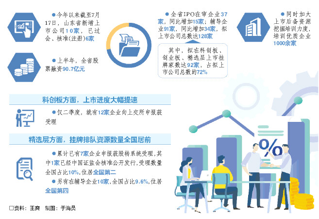 企业上市堪称区域经济发展的“助推器”和产业转型升级的“强引擎”。山东继去年IPO数量达到18家、创十年新高后,今年以来截至7月17日,新增上市公司10家,已过会和已核准公司6家;IPO排队企业数量呈现井喷之势,上半年全省在审企业37家,辅导企业91家。