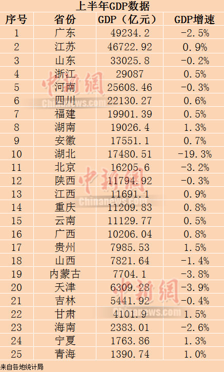 广东上半年GDP为49234.20亿元,同比下降2.5%;江苏上半年GDP为46722.92亿元,同比增长0.9%;山东上半年GDP为33025.8亿元,同比下降0.2%。