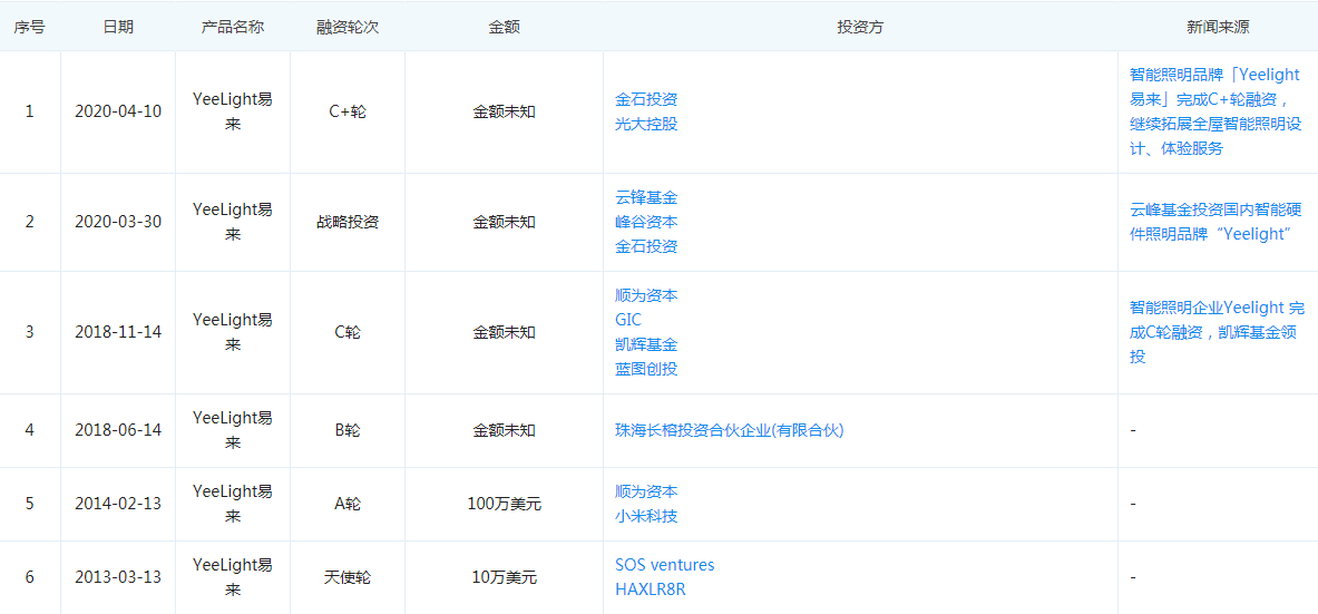 2018年11月,易来智能完成C轮融资,由凯辉基金领投,蓝图资本、顺为基金、GIC基金跟投。同年6月,易来智能刚完成来自珠海长榕投资合伙企业(有限合伙) 的B轮融资,。