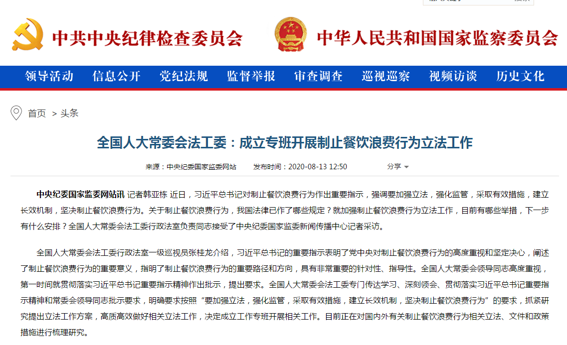 13日,鲁网·泰山财经记者从中央纪委国家监委网站了解到,全国人大常委会法工委决定成立专班开展制止餐饮浪费行为立法工作。目前正在对国内外有关制止餐饮浪费行为相关立法、文件和政策措施进行梳理研究。