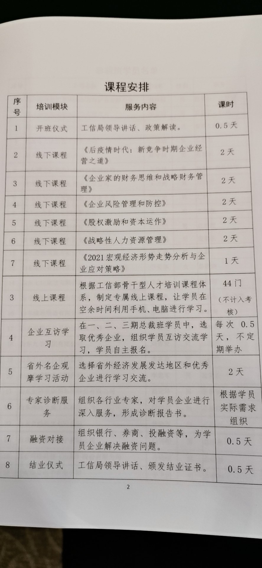 骨干型企业总裁班主要面向济南市大型企业、骨干企业、行业领军企业的董事长、总经理群体,整合了国内一流的优质师资资源,采用“面授课程+案例分析+线上学习+对标名企观摩学习+专家跟踪企业诊断辅导+融资对接”的授课方式,课程设置科学合理、内容丰富,既有理论面授,也有现场教学,既有企业互访,也有专家会诊,是理论与实践、交流与互鉴、培训与服务相互融合的学习平台。