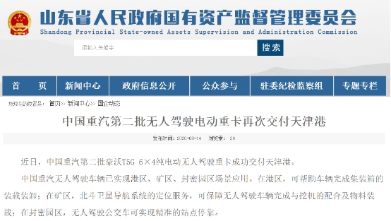 今日,鲁网·泰山财经记者从山东省国资委获悉,近日,中国重汽第二批豪沃T5G 6×4纯电动无人驾驶重卡成功交付天津港。
