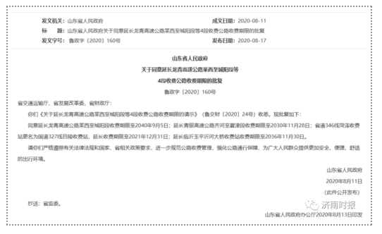 17日,山东省政府网站发布《山东省人民政府关于同意延长龙青高速公路莱西至城阳段等4段收费公路收费期限的批复》。