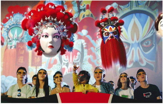 图为在济南方特东方神画园区,游客乘坐自动循迹无轨车绕园而行,在各种高科技模拟的戏曲环境中,近距离了解生旦净末丑的梨园精英,感受博大精深的非遗戏曲文化。
