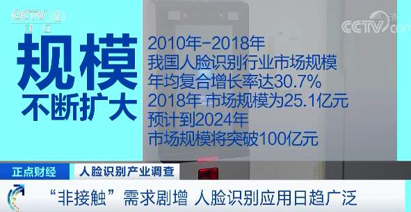 数据显示,2010~2018年,我国人脸识别行业市场规模年均复合增长率达30.7%。2018年,我国人脸识别行业市场规模为25.1亿元。预计到2024年,我国人脸识别行业市场规模将突破100亿元。