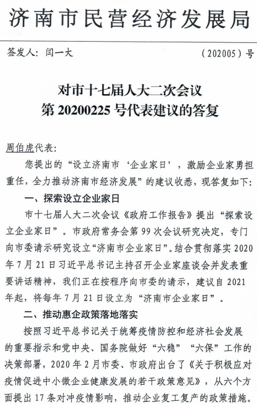 近日,济南市政府网站发布《济南市民营经济发展局对市十七届人大二次会议第20200225号建议“关于设立‘企业家日’,激励企业家勇担重任,全力推动济南市经济发展”的答复》。答复显示,济南市民营经济发展局正在按程序向济南市委请示,建议自2021年起,将每年7月21日设立为“济南市企业家日”。