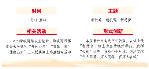 记者24日从省政府新闻办召开的新闻发布会上获悉,由国务院台办、山东省政府主办的第26届鲁台经贸洽谈会(简称“鲁台会”)将于9月1日至4日在潍坊市举办。本届鲁台会以“新战略 新机遇 新局面”为主题,设置了2020海峡两岸农业论坛、海峡两岸博览会云展览和“开放山东”“智慧山东”“健康山东”三大板块网上路演招商活动。