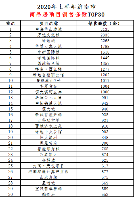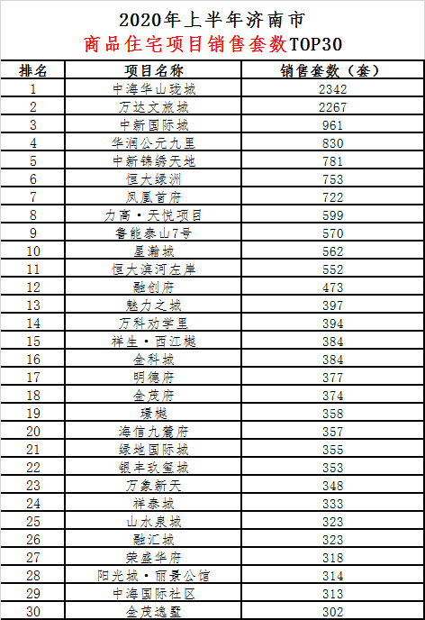 9.2020年上半年济南市商品住宅项目销售套数TOP30
