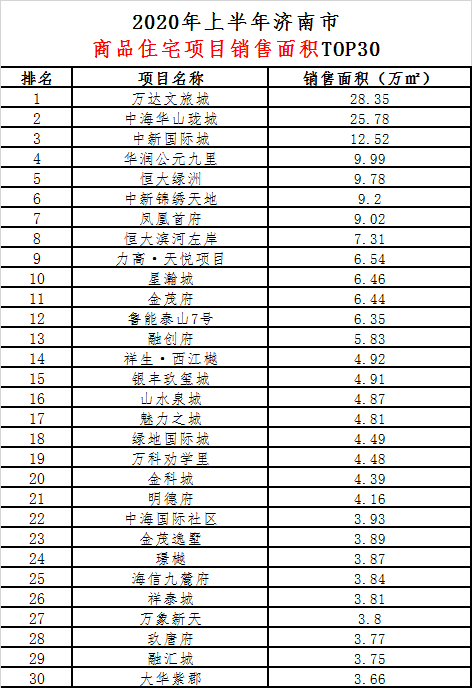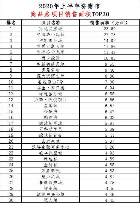 5.2020年上半年济南市商品房项目销售面积TOP30