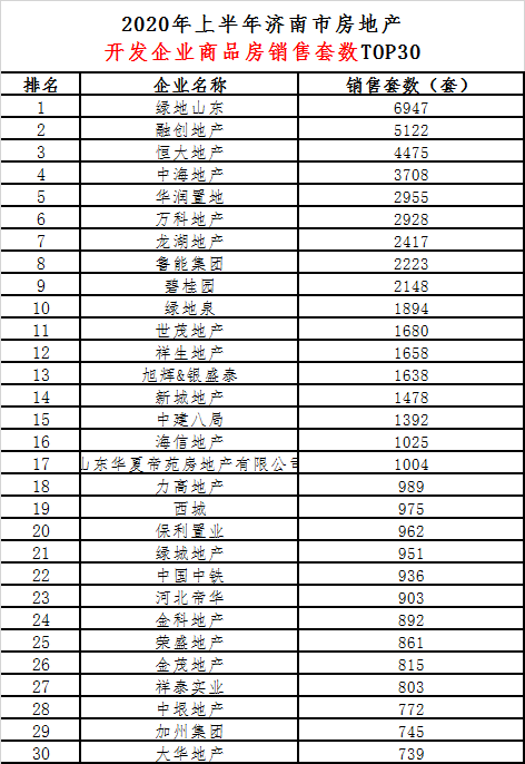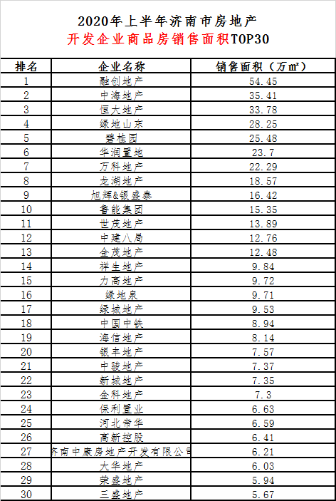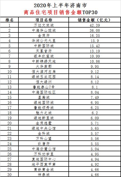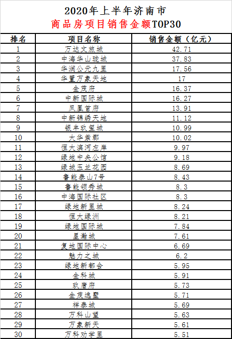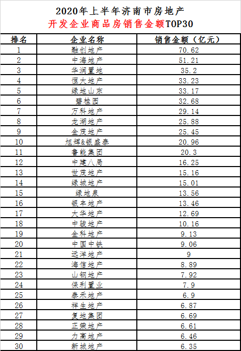 1.2020年上半年济南市商品房企业销售金额TOP30