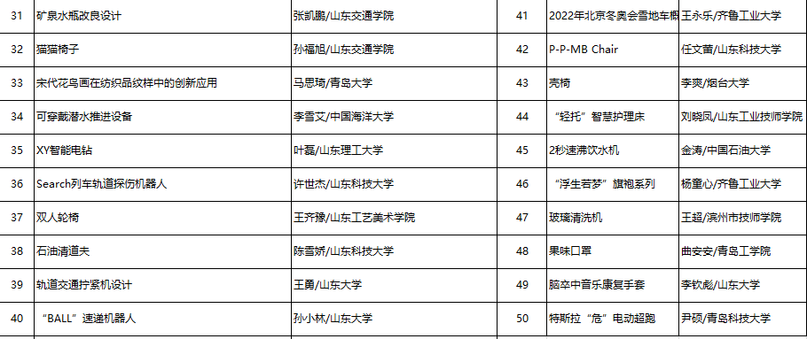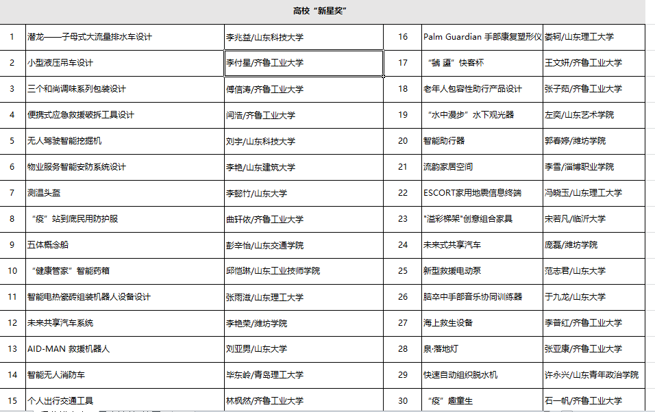 山东省第三届“省长杯”工业设计大赛高校“新星奖”名单