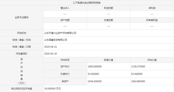 针对该企业财务报表无法显示的问题,企业回复因“业务无法提供”。另据山东天健兴业资产评估有限公司评估,标的企业资产总计1138.27万元,负债总计55.46万元,净资产1082.80万元,因此推算评估值为30万元。