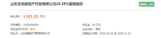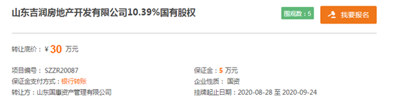 今日,山东国惠资产管理有限公司(以下简称“山东国惠”)在山东产权交易中心发布公告称,将以30万的底价出售子公司山东吉润房地产开发有限公司(以下简称“吉润房产”)10.39%国有股权。本次挂牌时间为:2020年8月28日至 2020年9月24日。值得注意的是,该企业曾于2008年两度以101.25万元价格挂牌出售股权。