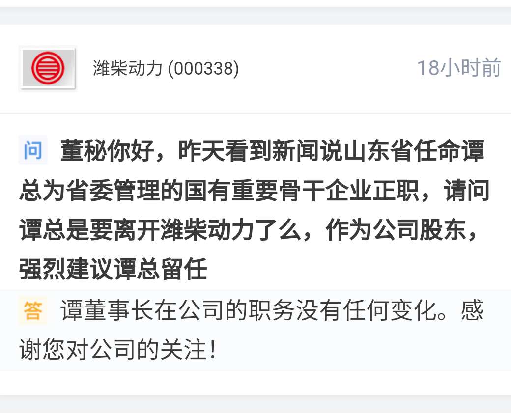 随后,潍柴动力股份有限公司回复称,“谭董事长在公司的职务没有任何变化。”