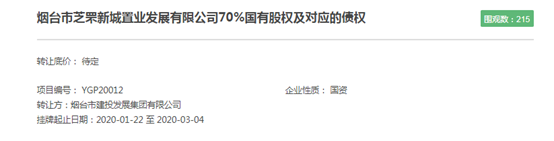 9月2日,烟台市建投发展集团有限公司(以下简称“烟台建投”)在山东产权交易中心发布公告称,将转让旗下烟台市芝罘新城置业发展有限公司(以下简称“烟台新城置业”)70%国有股权及1.78亿元债权,转让底价为2.06亿,挂牌时间为2020年9月2日至9月28日。