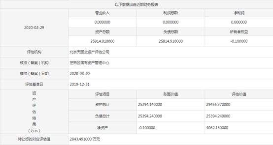 根据标的企业财务报表显示,截至今年2月底,该企业营收和净利润一直为0元,资产总额达2.58亿元,负债总额2.58亿元。另据北京天圆全资产评估公司评估,该企业资产总计2.95亿元,负债总计2.54亿元,净资产4062.13万元,推算标的评估值为2843.49万元。