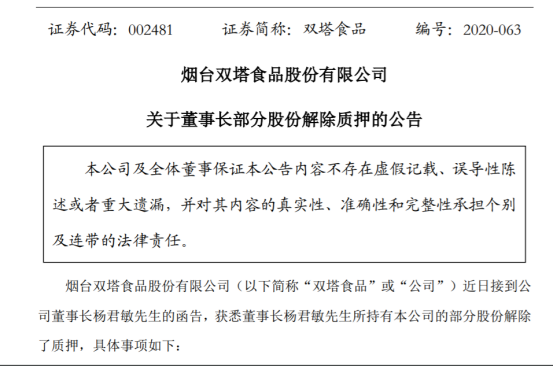 鲁网·泰山财经记者今日于深圳交易所处了解到,烟台双塔食品股份有限公司(双塔食品.002481.sz)近日接到公司董事长杨君敏的函告,获悉其所持有的公司42万股股份已解除质押。
