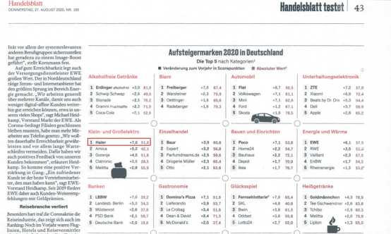 近日,权威调查研究机构YouGov对德国各行业的一项民意调查结果在Handelsblatt(商报)刊登。在家电领域,海尔智家获评"2020年消费者推荐最佳品牌"第一名。