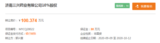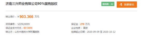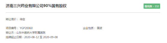 今日,山东产权交易中心公告济南三兴药业有限公司(以下简称“三兴药业”)股权转让的信息,山东中医药大学附属医院(以下简称“山东省中医院”)以903.37万元转让所持90%股权;该企业法定代表人郭兴奎同时以100.37万元转让所持10%股权。值得注意的是,今年8月,山东省中医院曾将其所持90%股权进行预挂牌,当时的转让价未定。